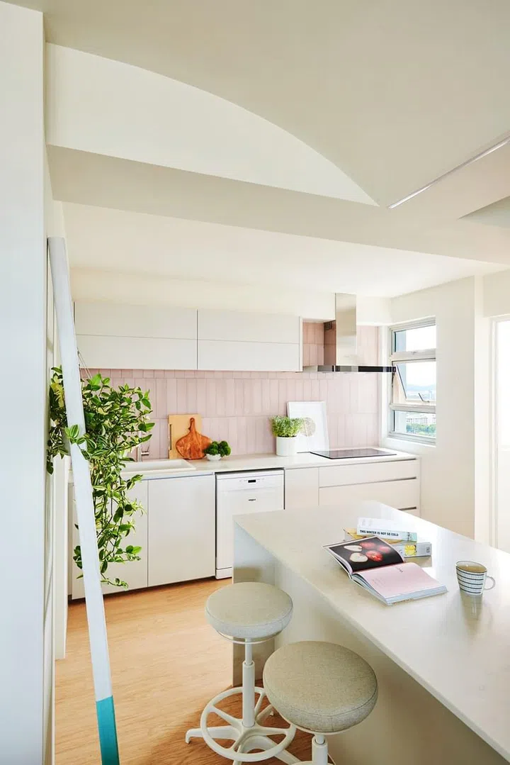 The other end of this extra-long island is a breakfast nook for the couple. Flooded with natural light and enlivened with dusty pink Hafary tiles forming the backsplash, this cheery corner is where Natalie and Christopher can enjoy a cuppa or a light bite when relaxing.