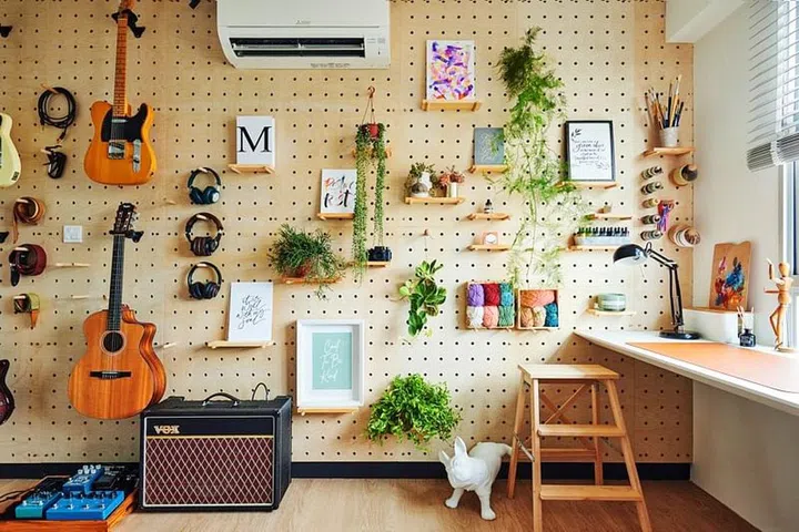 The remaining two rooms are the guest room and the study, which husband and wife share. In pride of place is a full-length pegboard wall which showcases the couple’s interests, with Natalie’s handicrafts taking up one side and Christopher’s audio equipment on the other. “This pegboard lets them move things around and set up shelves as they need,” explains Chris. “It really lets them express their creativity.”