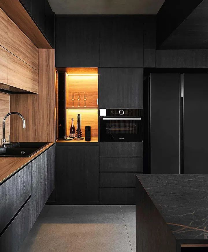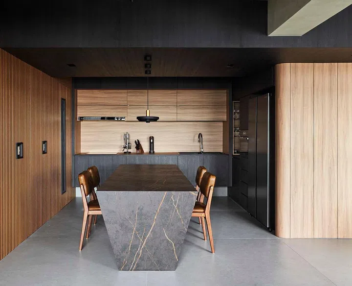 That's how the island became a dining table, too. The black and gold Dekton top appears as a large stone slab on top of the carved wood with a tapered base. Its monolithic form is a direct reference to brutalist architecture.