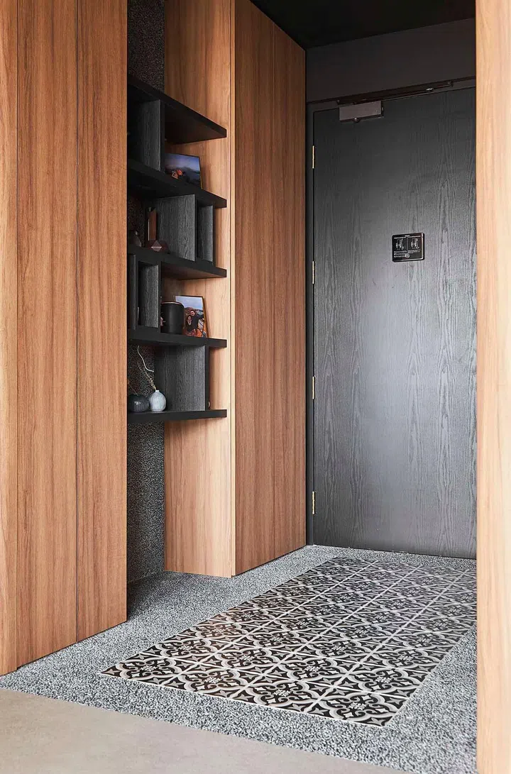 The entrance foyer is a vestibule between the external corridor and the internal living space. It is accented by Peranakan-inspired tiles with a granulated pebble finish border.