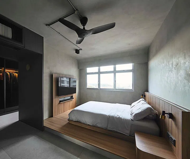 The master bedroom is an oasis of calm with an elevated platform bed that appears to float.
