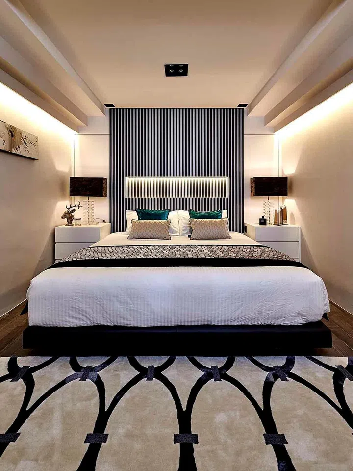 Its white leather wallpaper and customised pillow covers are stylish details that catch the eye, but the real winner of this bedroom is its lighting.