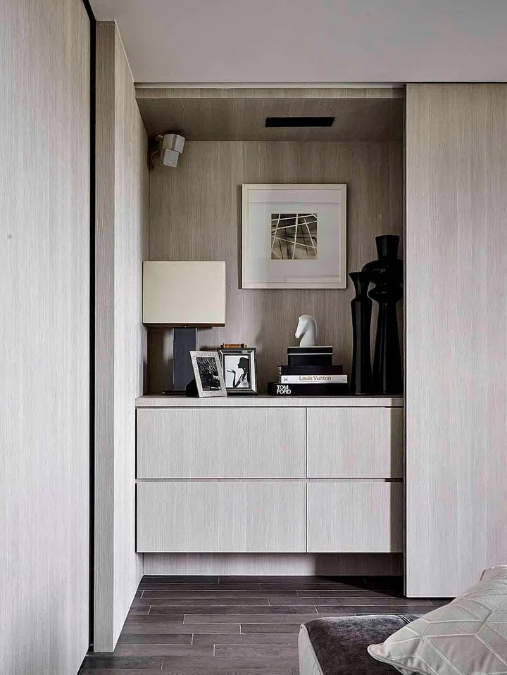 As his client loves to read, Adrian incorporated a backlight in the headboard. The cove light imbues the room with warmth, while the dimmable halogen light above the bed is mood lighting.
