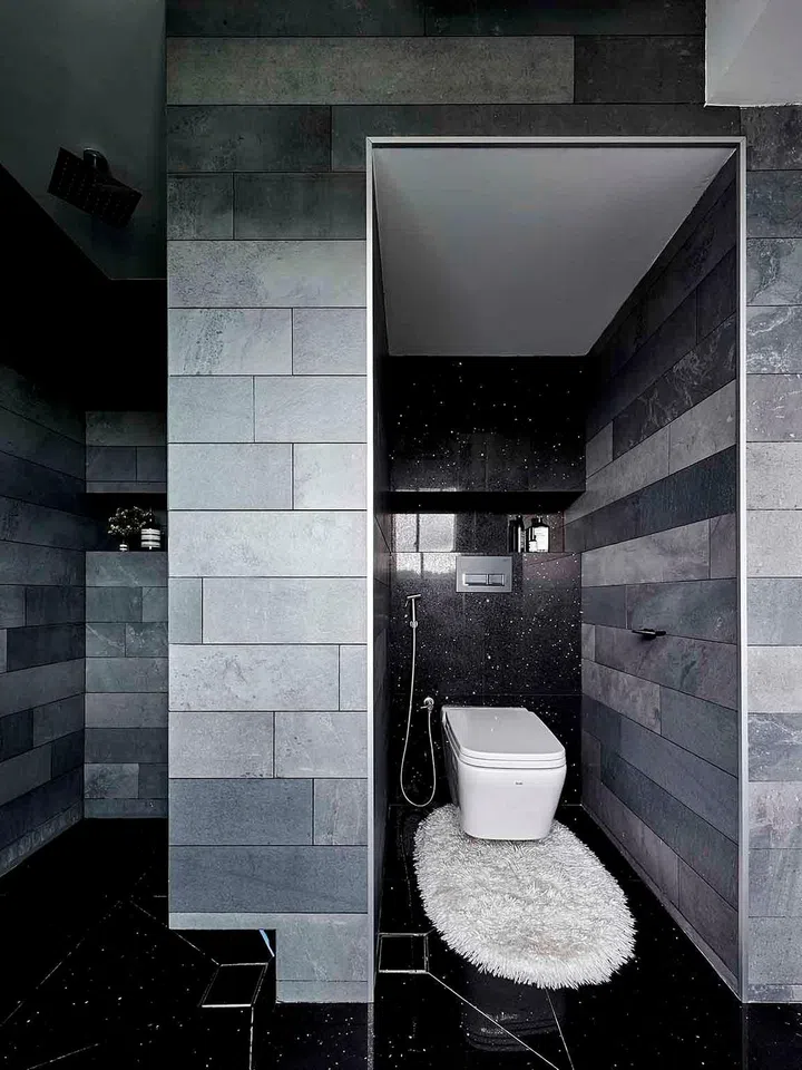 Black quartz is paired with Italian grey stone tiles – it is both luxurious and minimal, masculine and chic.