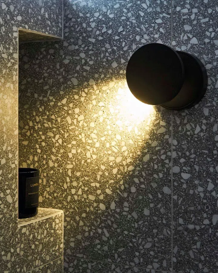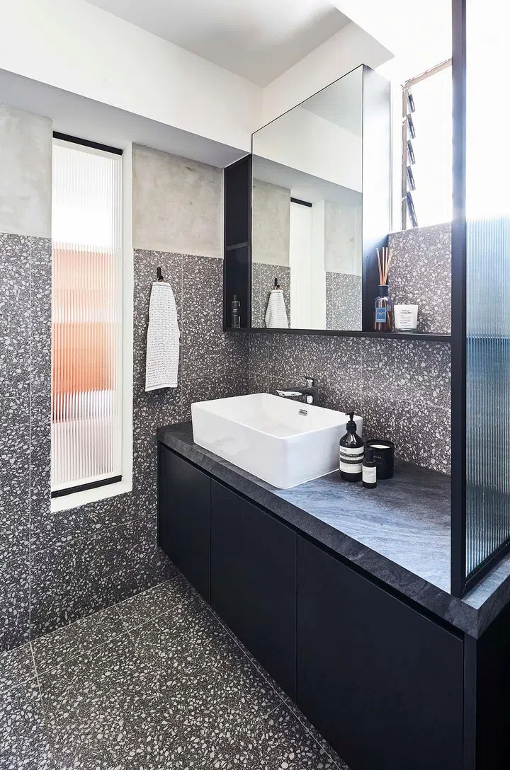 Rei also created a fluted glass partition, so that the couple can stay connected even when one person is resting in the bedroom and the other is making coffee in the kitchen. It also has the effect of letting more light through and visually expanding the space.