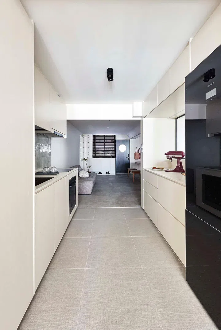 Rei resolved this by building full-height cabinets down the length of one wall, ensuring they were 60-70cm deep for sufficient storage.