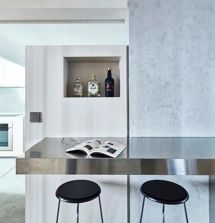 Behind is the couple’s bar and a niche for storing their liquor, as they love hosting gatherings. The bar is in stainless steel for a more urban, edgy look. “The use of different materials also helps to create different zones,” says Rei.