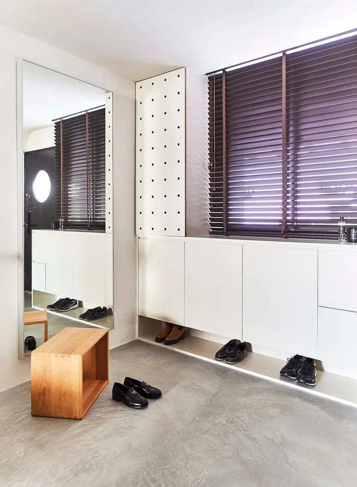 Even the front door is free of visual distractions, thanks to the lack of a gate, and a large fluted-glass porthole in place of the usual peephole and doorbell combination. According to Rei, the couple feels safe enough to do this as Jody knows the neighbourhood well.