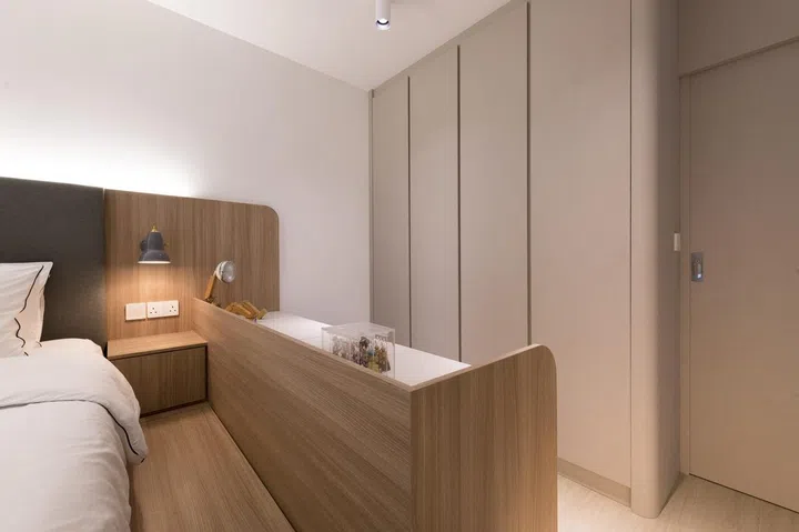 With this design brief in mind, Philip created a bright and airy home that features soothing colours and rounded edges. Plenty of hidden storage was also needed, so he also incorporated elements like a platform bed and a fluted-panelling wall to conceal the bomb shelter and shoe storage.