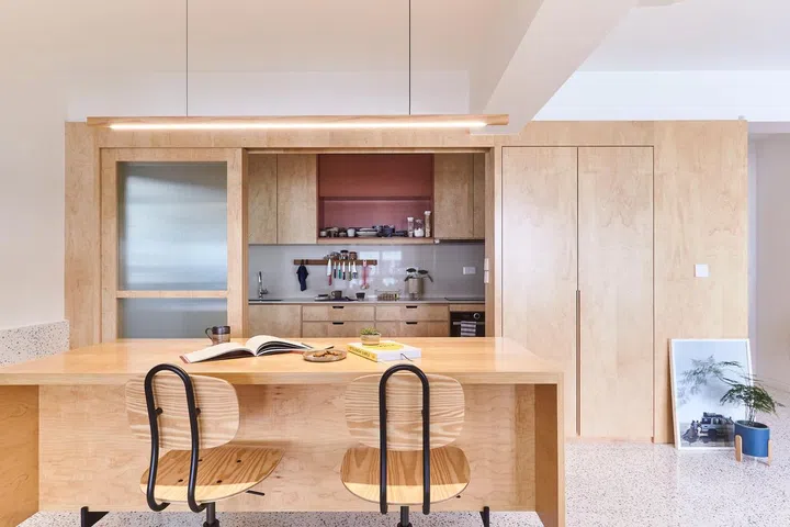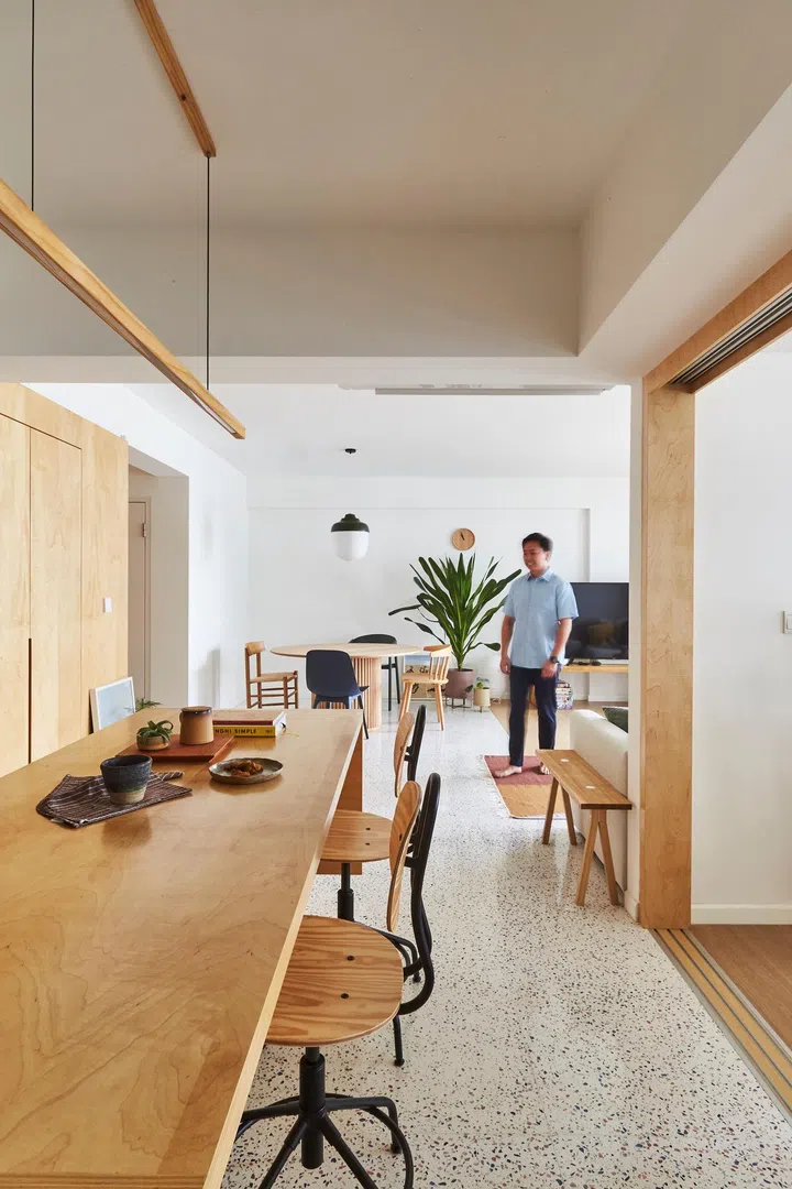 Sujono had proposed an open plan with two-toned floor; the living room and bedrooms would feature a light wood flooring, and the rest a speckled terrazzo floor. The area comprising the study room and kitchen were also configured in a symmetrical setting. Both spaces feature a set of ribbed glass sliding doors, while a long wooden island — customised as a loose piece of furniture — sits between them. The renovation cost totalled to $65,000.