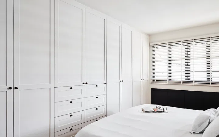 The wardrobes in the master bedroom feature the same French molding in white, for instance, and all the switches in the home have the same champagne hue from wiring specialist Legrand’s Galion series.