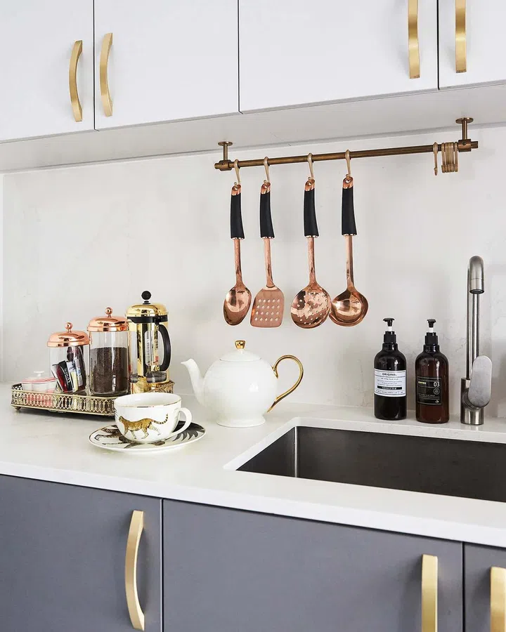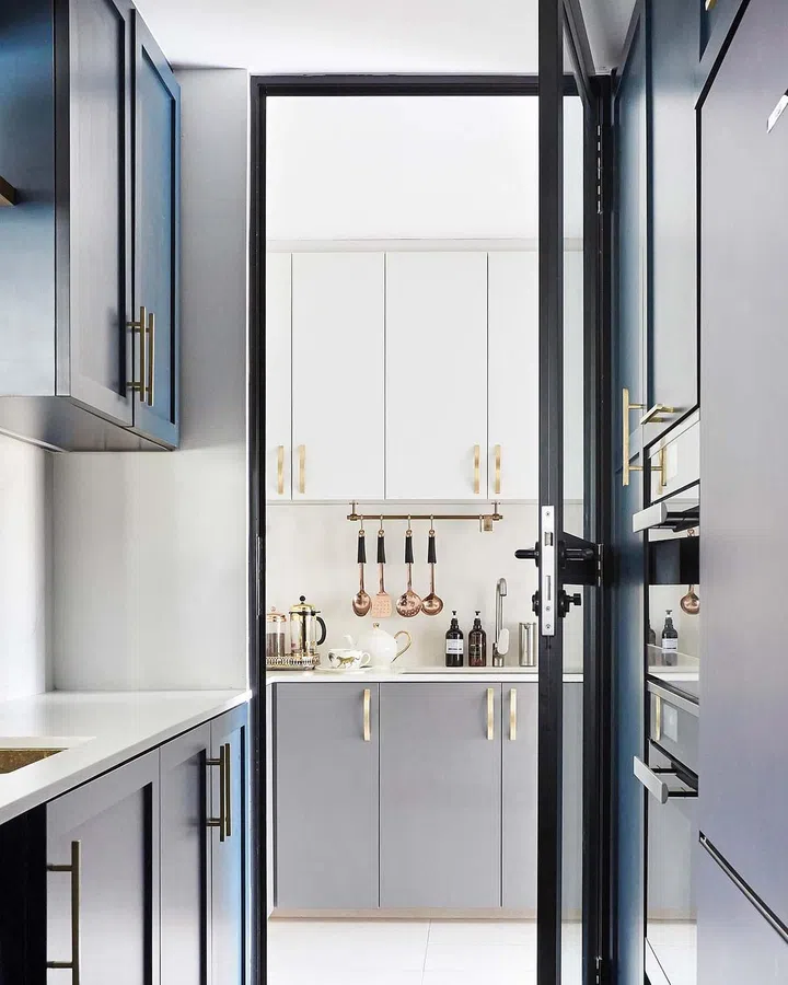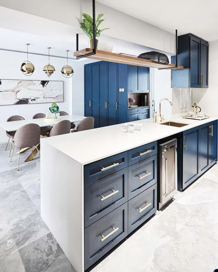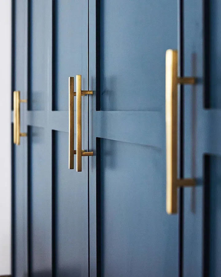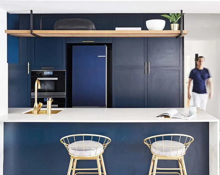 Rather than blending into the rest of the home, though, the panelling – also known as French moulding – is a feature in itself. Done in the same deep blue as the kitchen cabinets, and accented by brass handles, the panelling adds a distinctively classic yet contemporary look.
