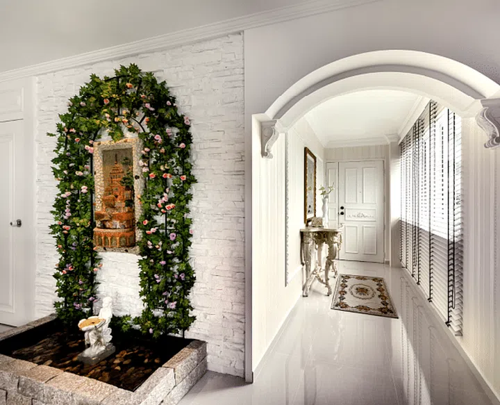 As the Victorian era was known for its elaborate gardens, the couple wanted their own, too; a water feature clad in artificial plants and roses was a vibrant addition to the pristine white-gold interiors.