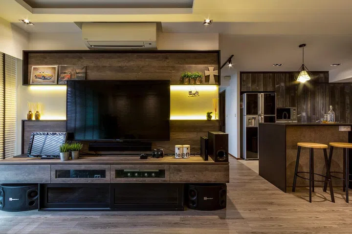 Dark wood-look laminate is chosen for the TV console, which offers just enough display area for the homeowners' collection of knick knacks. Backlit lights add to the warm ambience in the space.
