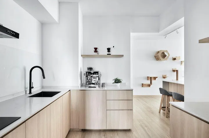 When it came to the issue of maximising the limited space, an open-concept kitchen with an island counter was the answer. The couple loves having their breakfast here in the mornings while watching their cats gambol around.