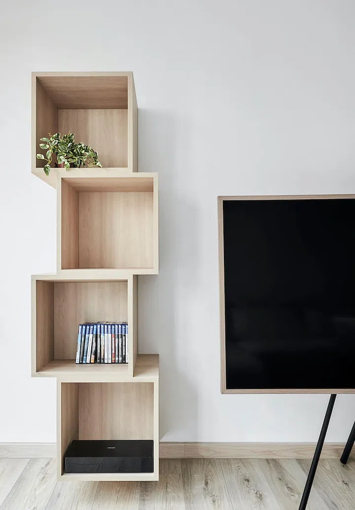 This bookshelf mimics the vertical lines of the climbing frames, providing the couple a space for displaying items and also a nook for their cats to rest in if they choose to.