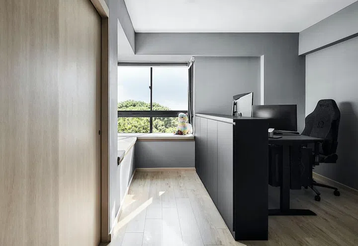 A built-in wardrobe serves as a partition between the master bedroom and study, which are accessible via a sliding door. The study features a bay window with a window seat, where the cats love to bask in the sun while the homeowners check their emails.
