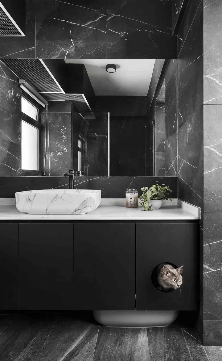 Even the bathroom is shared with their feline friends – the homeowners requested a custom built-in nook for a litter tray within the vanity itself, tucked neatly out of sight.