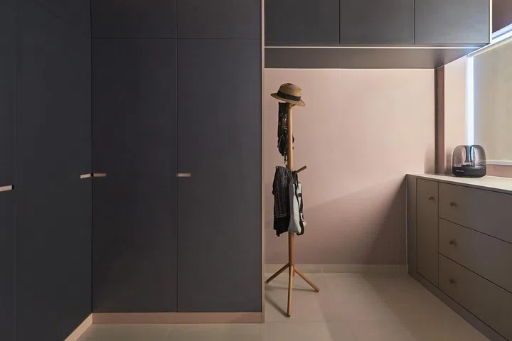 Jeri took the opportunity to introduce shades of pink – she wanted something that wasn't too sweet, so she opted for a muted blush that goes well with the grey of the walk-in wardrobe area.