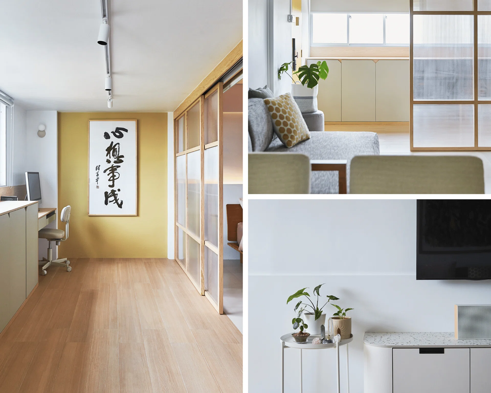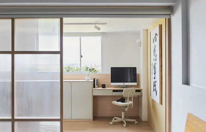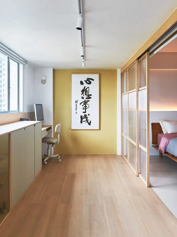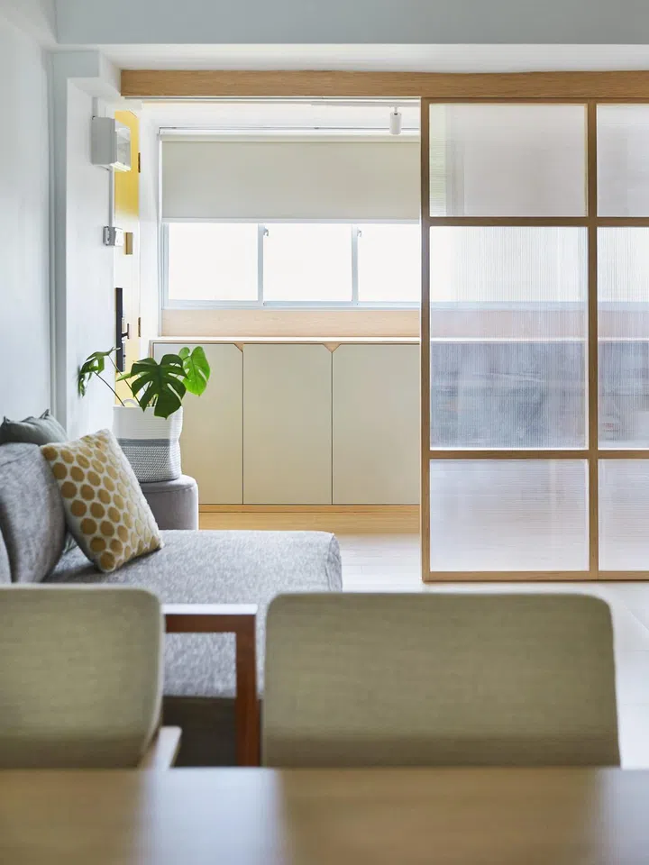Shōji-inspired doors, an open concept, and some clever reconfiguration make this three-room HDB flat in Ang Mo Kio a spacious haven for its owners.