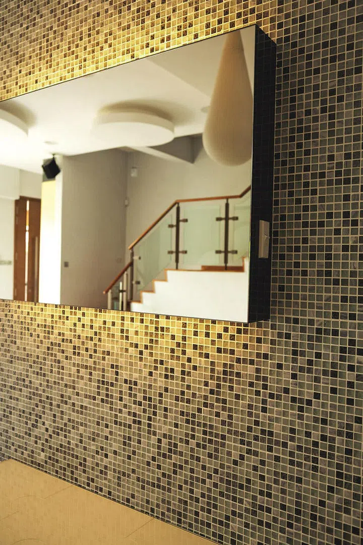 Recessed lighting is built around the mirror for ambient lighting in the dining area. To delineate the living and dining areas, the walls at the dining area are in grey mosaic.