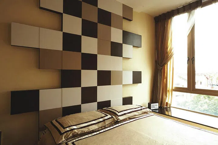The bedroom features latte and mocha tones for the laminated squares that make up the headboard.