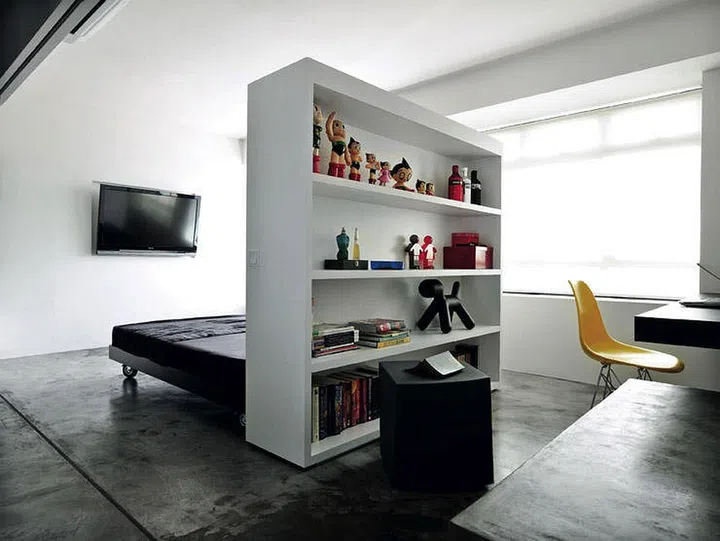 The bedroom was further zoned into resting and study areas with the help of a standalone shelf rather than a wall. This helped keep the flow of space more organic. The translucent bookshelf creates a subtle visual boundary while allowing light to filter through – a genius solution for maintaining the home’s open feel while still defining functional zones.