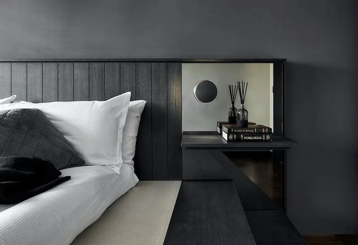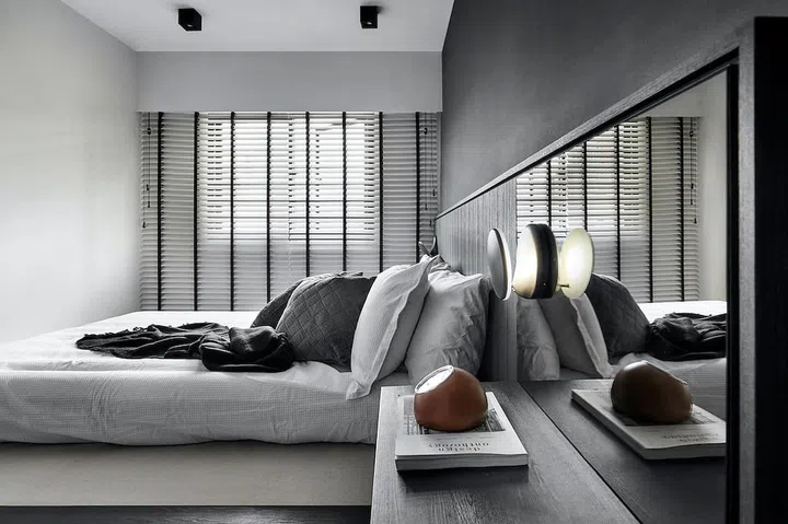 In the master bedroom, Happe Design Atelier adopted a similar monochrome palette, adding mirrored elements to elevate the look.