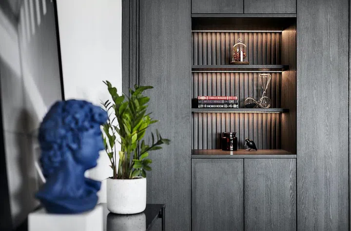 A backlit display niche is a great way to make use of vertical space and adding a luxe touch.