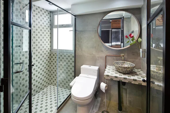 Mosaic-tiled walls in a bathroom is referenced in the vanity stand.