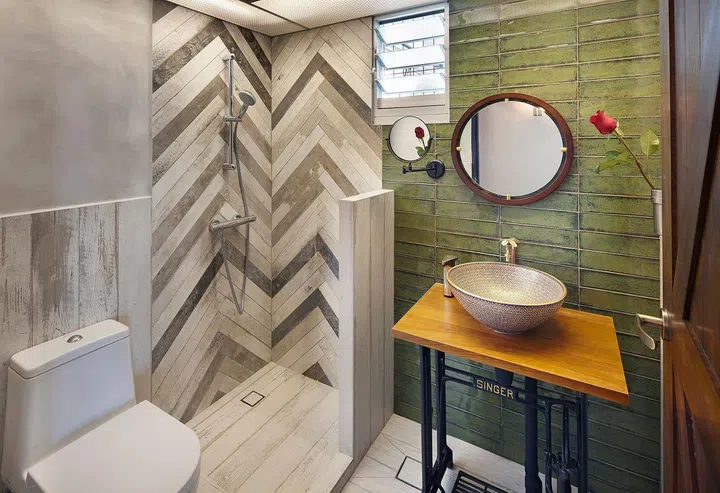 Topping off the look is a quirky vintage tableau, which comes in the shape of the exotic washbasin sitting atop an upcycled Singer sewing machine.