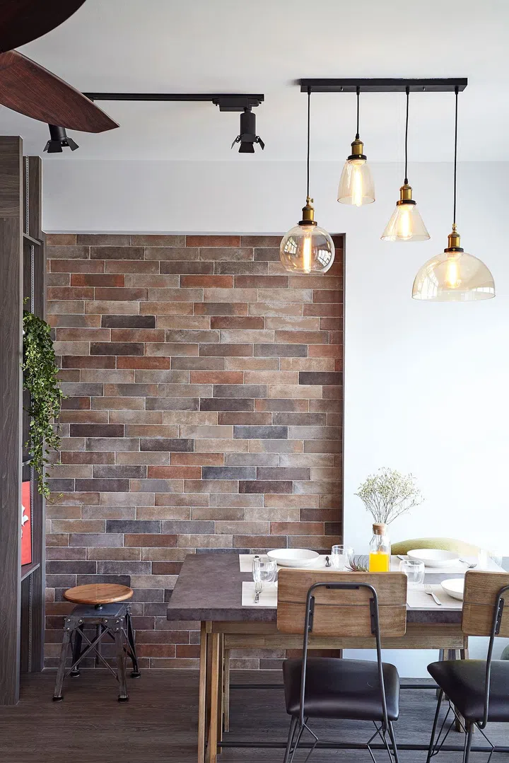 An exposed brick wall in the dining zone lends texture and a sense of warmth, as does the deep brown grain of the vinyl floor that runs throughout.