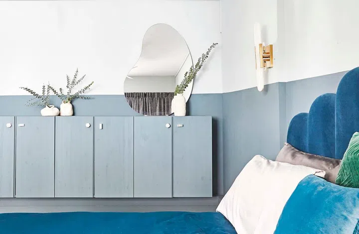 The walk-in wardrobe comes trimmed with peach-toned neutrals, whereas the bedroom is awash with deep green and navy blue hues.