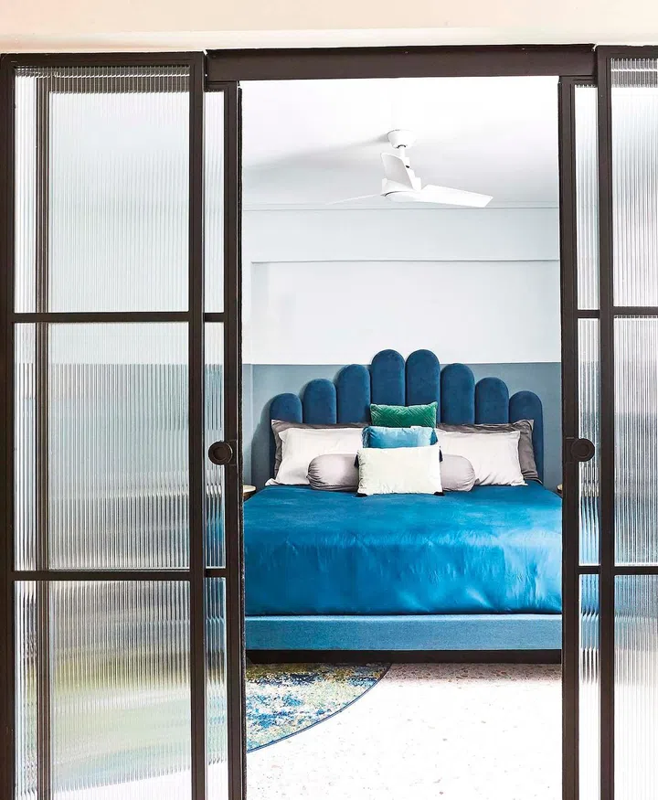 The remaining two bedrooms were combined to create a master suite with a walk-in wardrobe and a bedroom separated by a fluted glass sliding door. Both are minimalist to create a conducive ambience for rest.