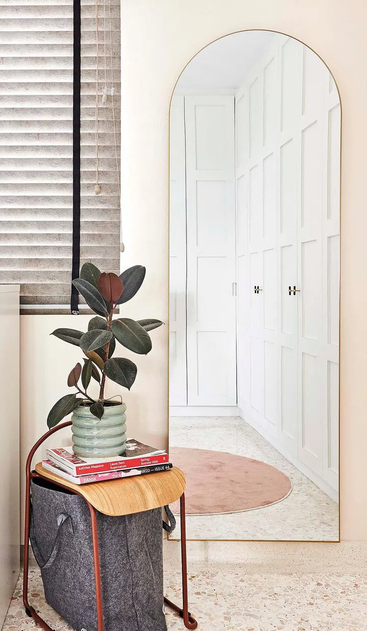 The arched mirror visually enlarges the walk-in wardrobe area.