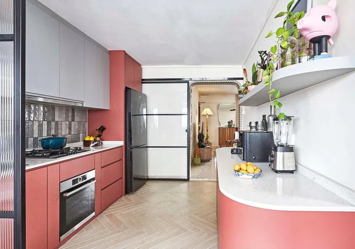 Featuring a beige, grey, and terracotta red colour scheme, the kitchen cabinets are new. “We didn’t try to match everything,” says Yu Ran.