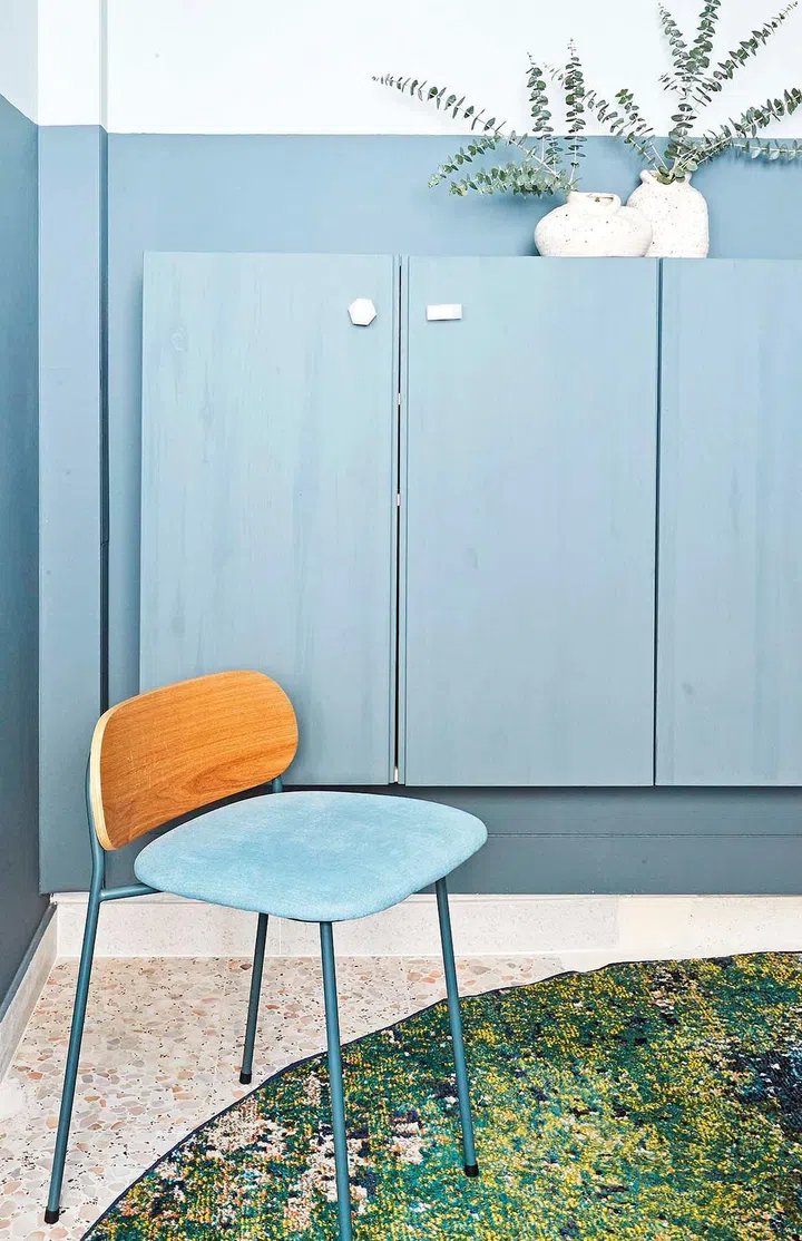 “We knew we'd run out of closet space soon, so we added these Ikea cabinets as extra storage,” says Yu Ran. He hand-painted these himself.