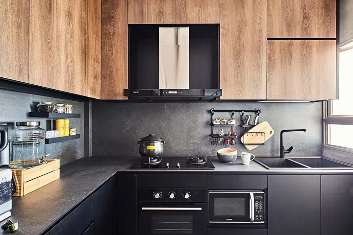 The kitchen pairs matt black surface with marble-and-wood-texture finishes.