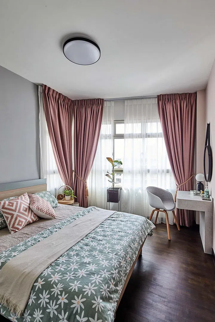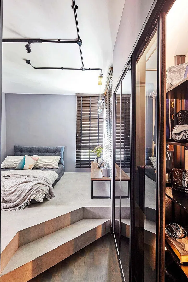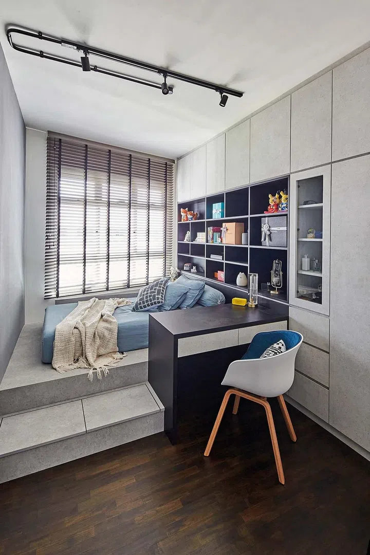 The bed is elevated on a platform that offers more storage and a study nook. The fully glazed window provides ample natural light that makes the room feel airy.