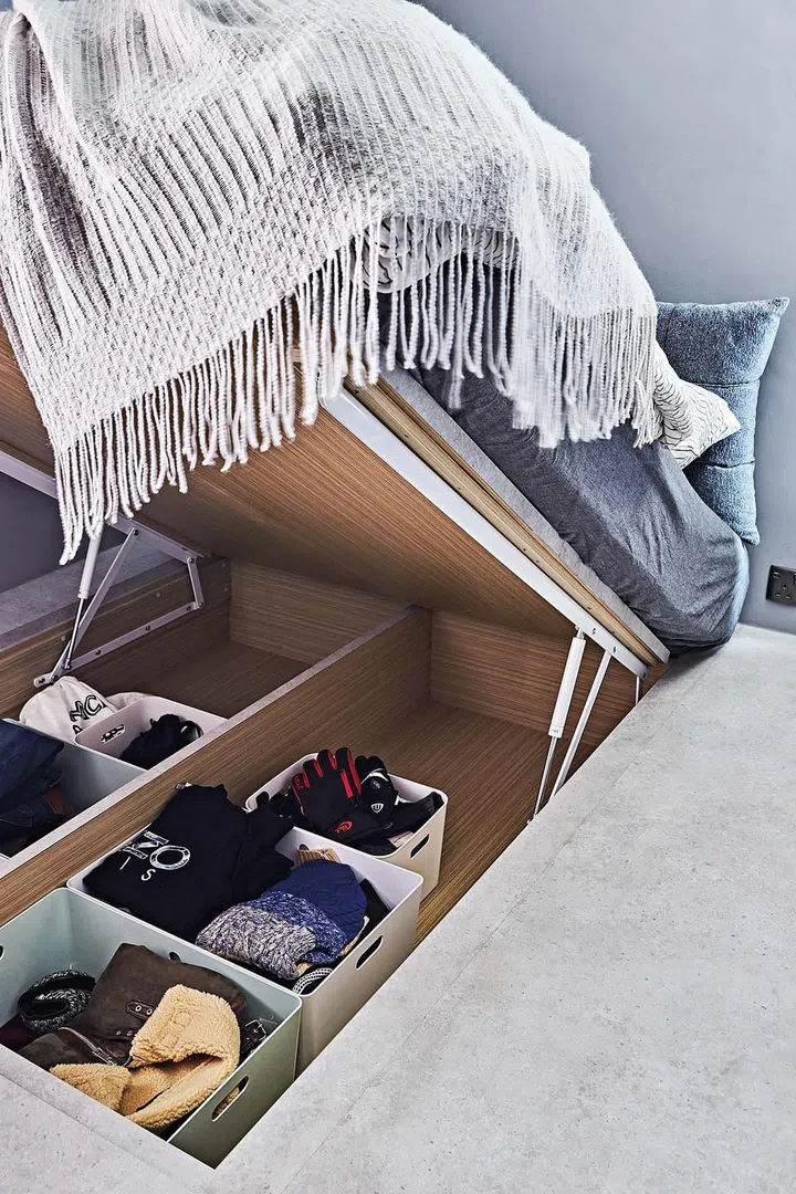 One side of the wall is dedicated for a wardrobe while the bed is elevated on a storage platform that lifts open to offer generous storage compartments that can fit anything from clothes to bulky luggage.