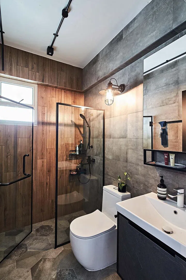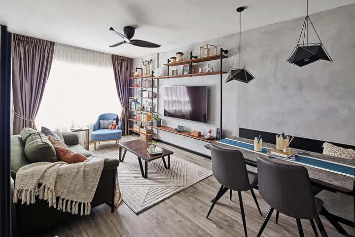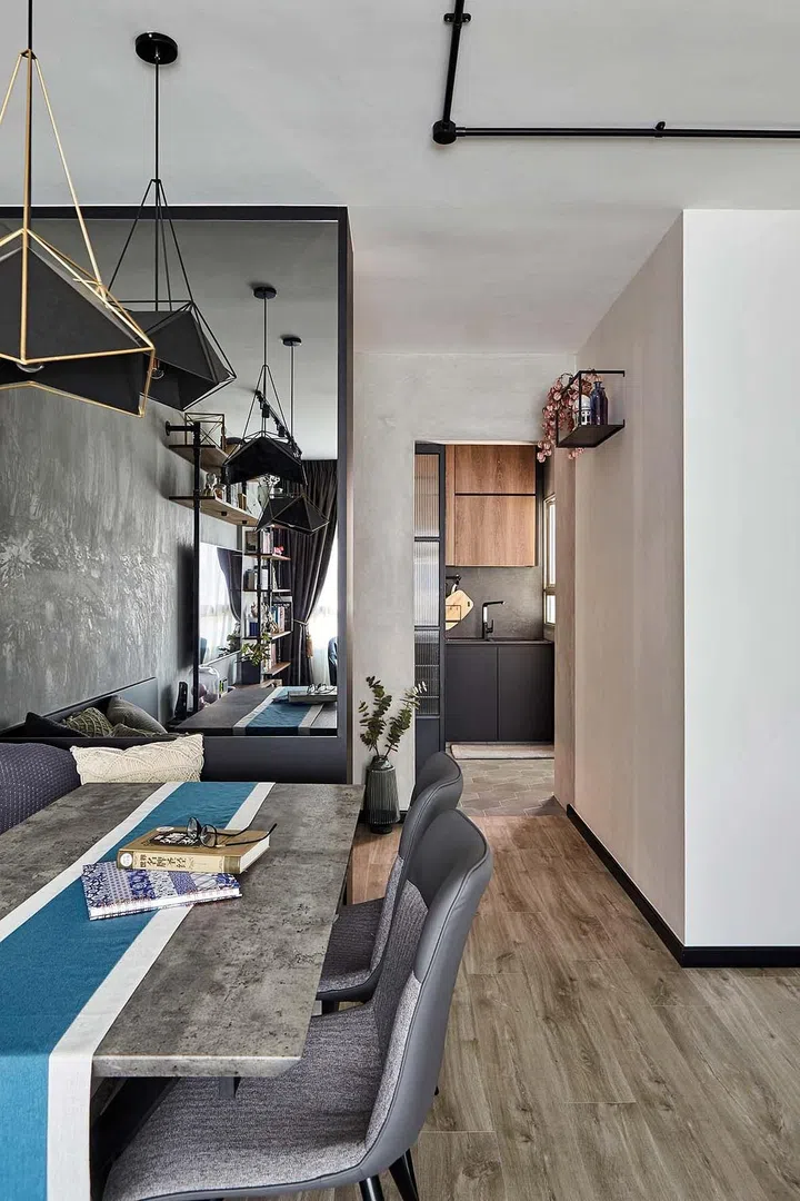 Masculine material palette meets playful details in this handsome 4-room resale HDB flat in Sengkang.