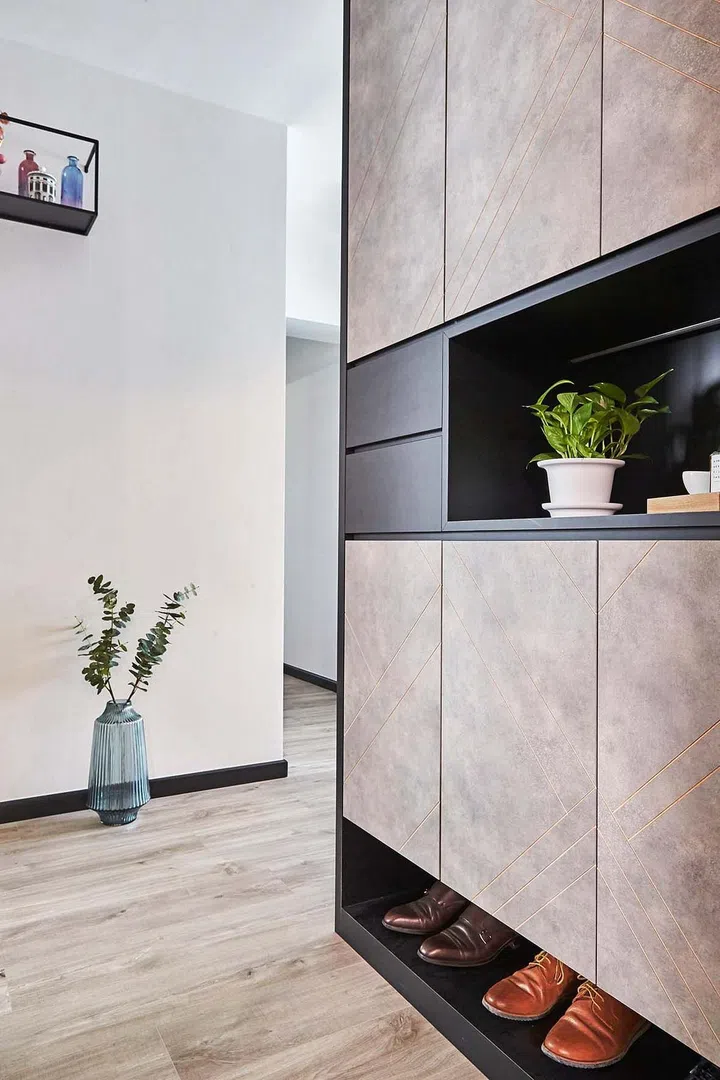 Inside, a shoe cabinet sporting concrete-like laminate with subtle geometric pattern hides the dining and living area beyond.
