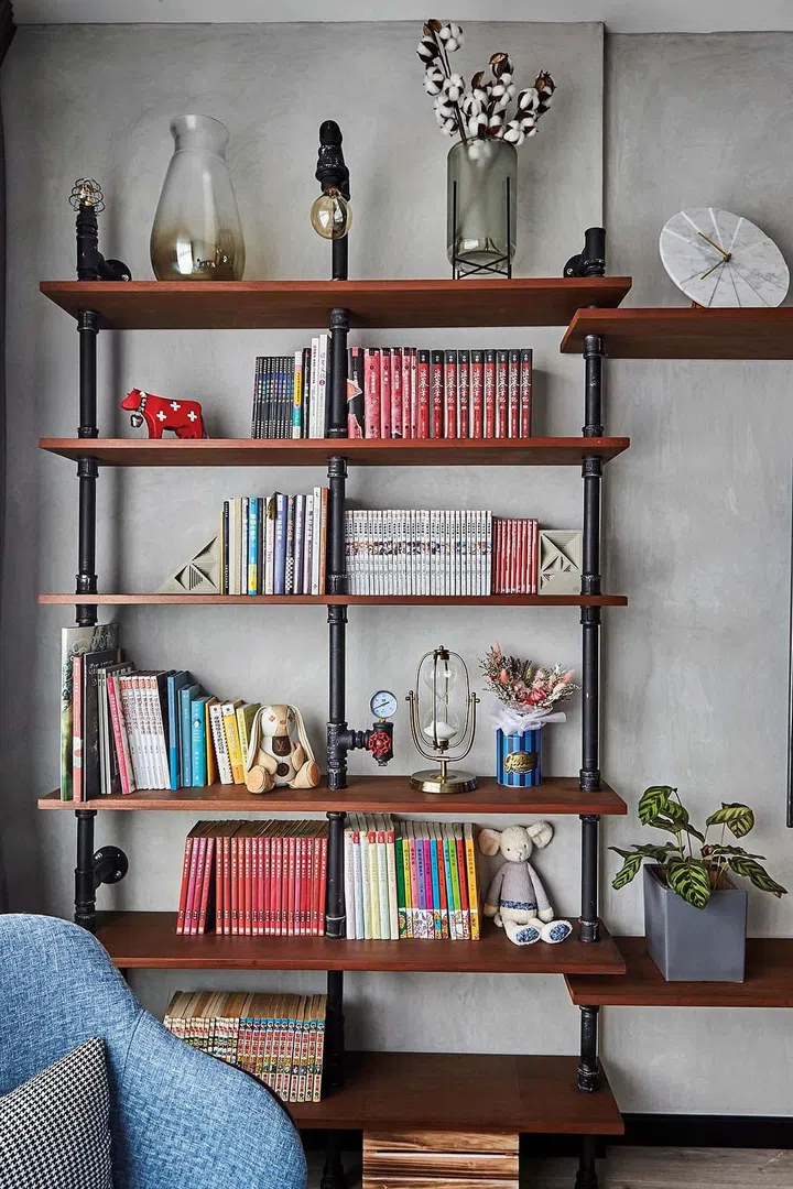 The custom-design wall-mounted bookshelves features steampunk details like metal pipe structure and a naked lightbulb.
