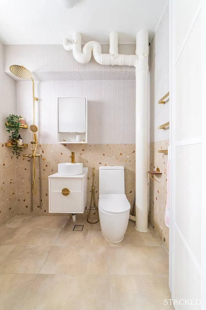 One of their bathrooms has a warm tone with terrazzo tiles.