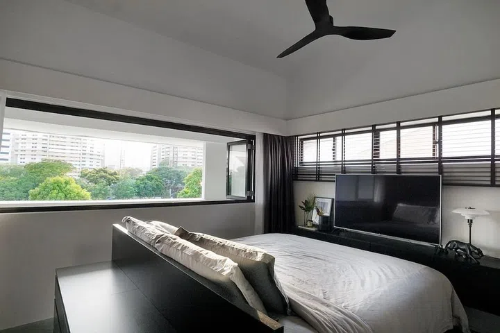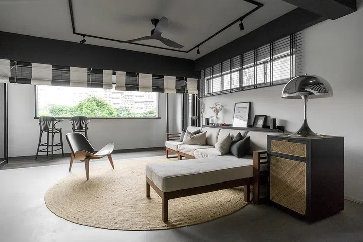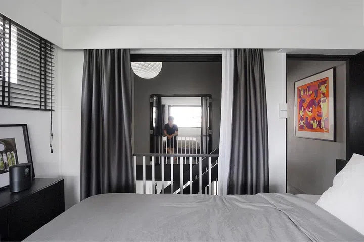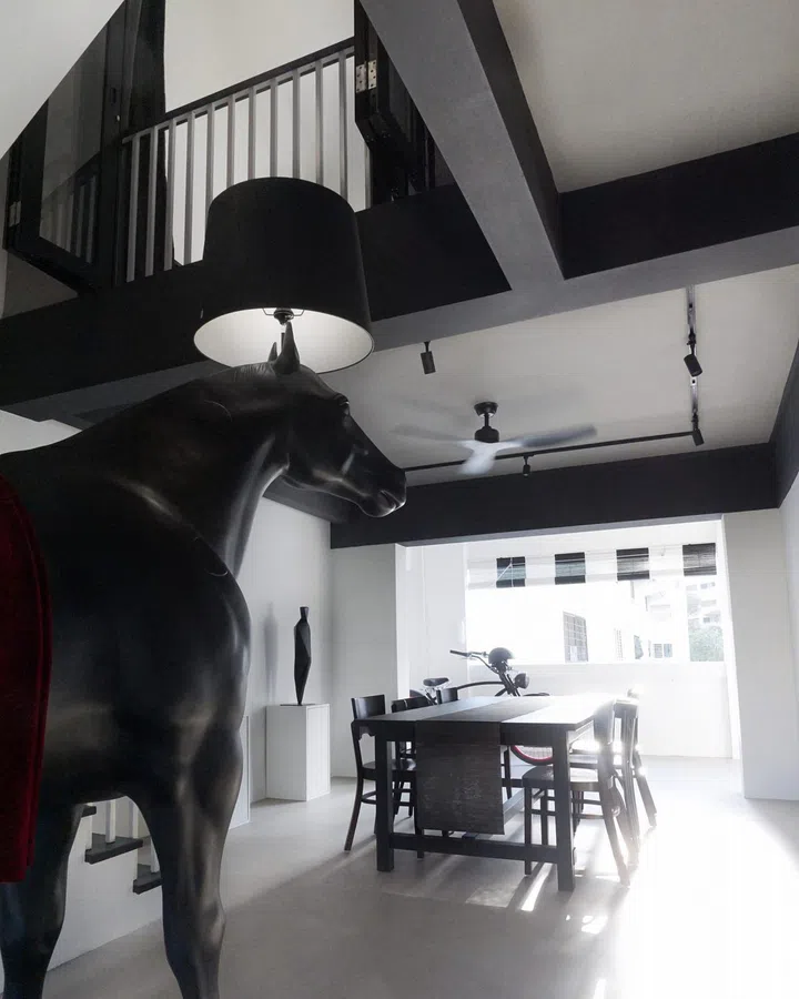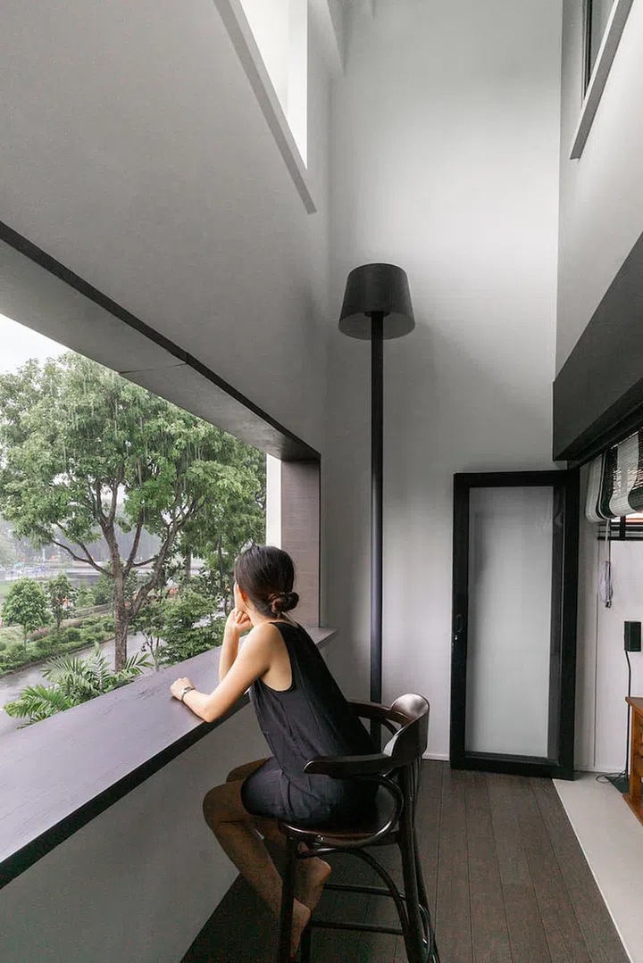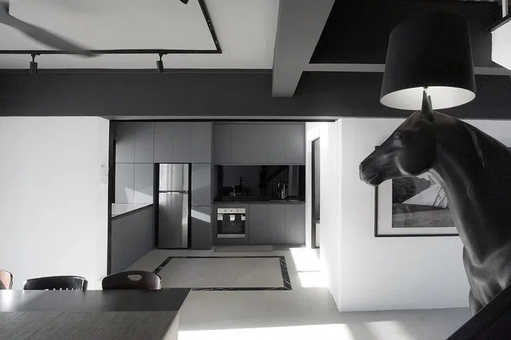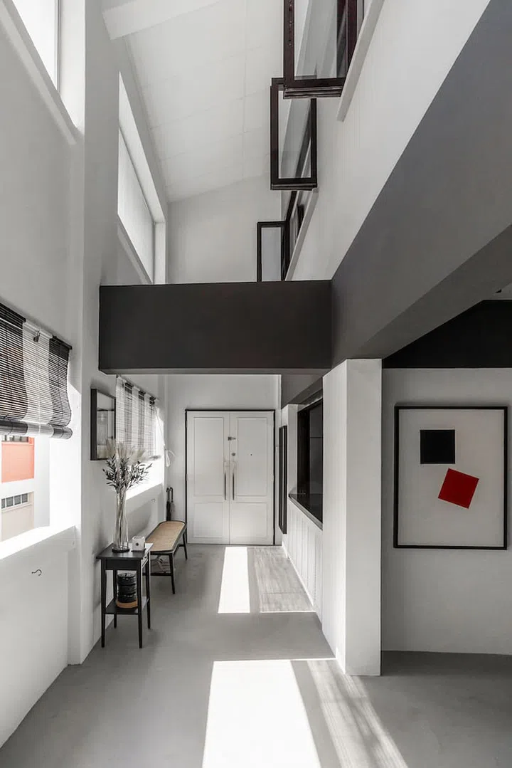 A monochrome palette is used to cleverly create the illusion of a "house within a house" in this Potong Pasir executive maisonette.