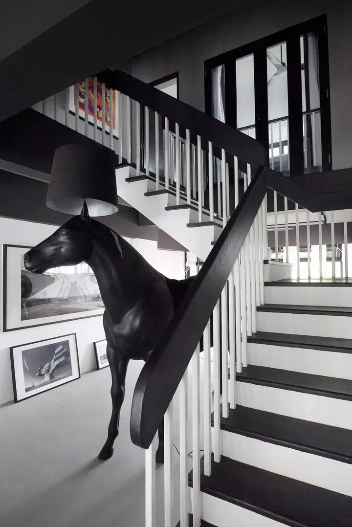 The homeowners' life-sized horse lamp by Moooi and their collection of paintings lend an art-gallery feel to the home.