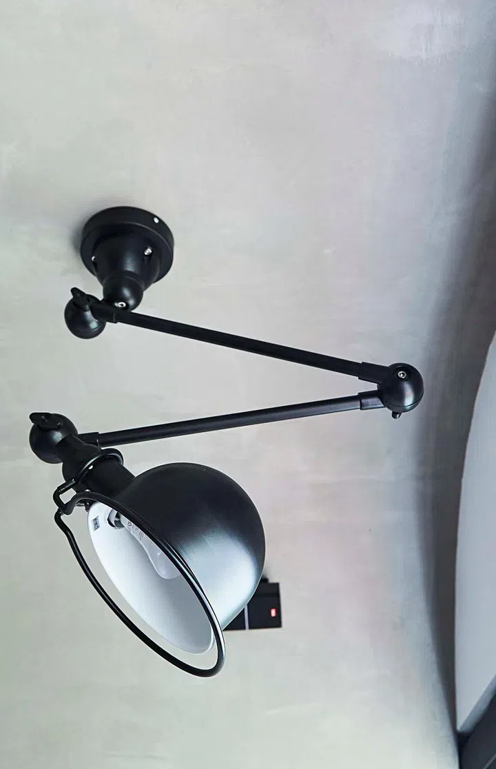 Little details, like this old-school wall lamp installed on the curved ceiling, lends a cool industrial look.