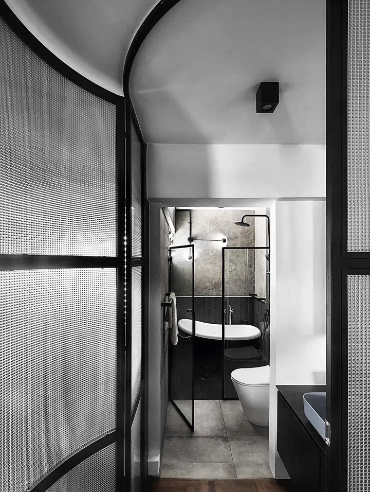 Paired with a curving steel frame, it evokes a chic retro vibe. Behind it is a spacious bathroom, which has been enlarged to accommodate a bathtub.