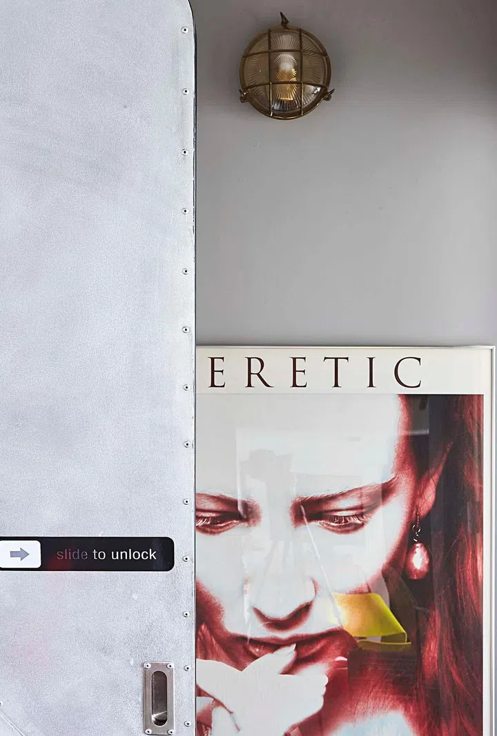 The door of the master bedroom is a custom aluminium flight wing with rivet studs, rounded corners and stripes of colour that might fool onlookers into thinking that it’s taken from a real plane.