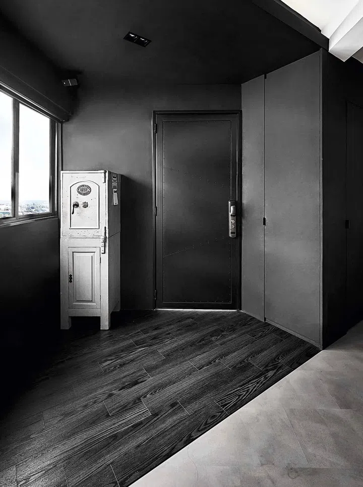 The foyer area features the same shade of deep black, featuring dark timber-look tiles, a black ceiling and black walls. Black storage next to the door creates an angle while a white-painted shoe rack stands out on the other side.